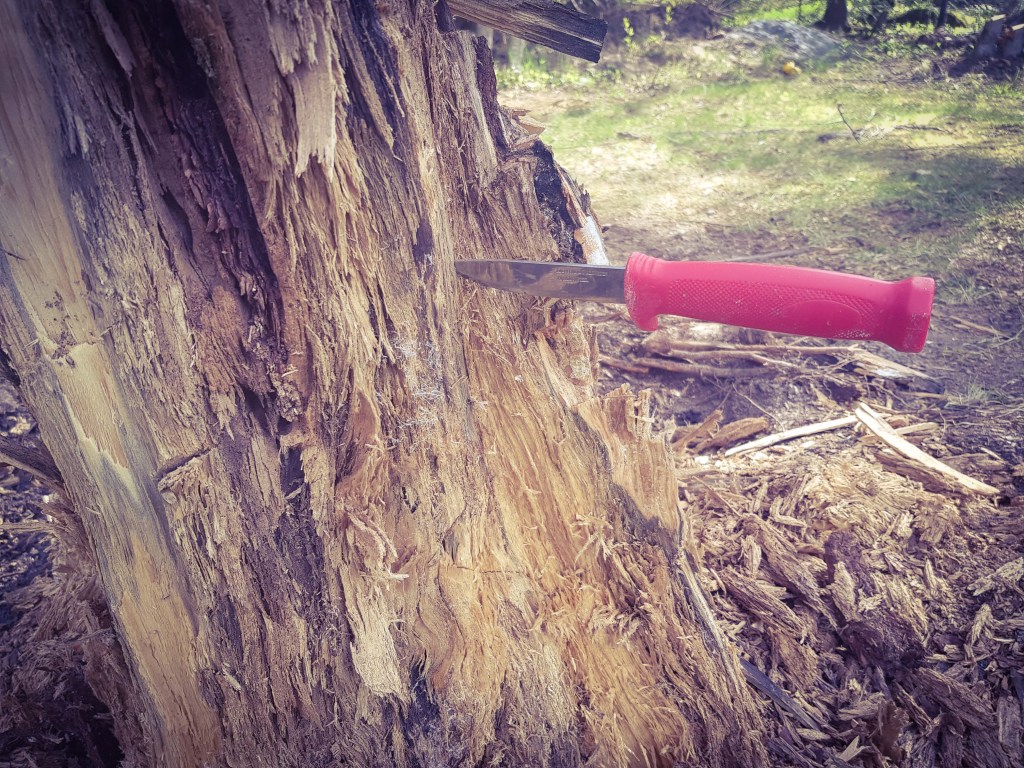 Siirryimme ulos ja valmistauduimme oikean laivan rakentamiseen. Pohjaksi valitsimme palan vanhasta kannosta. Sopiva pala irtosi kirveellä ja työkaluna käytimme puukkoa.